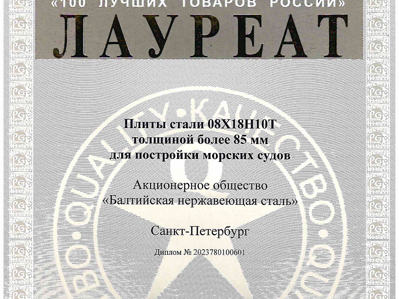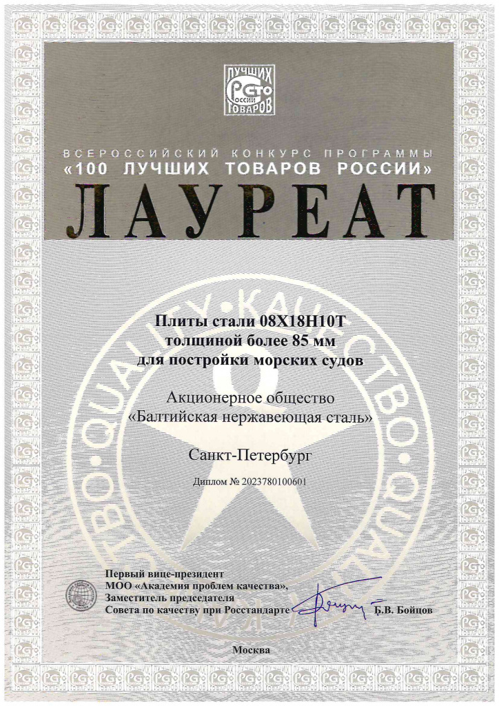 Компания "Балтийская нержавеющая сталь" получила диплом №2023780100601 Всероссийского конкурса программы "100 Лучших товаров России" за продукцию "Плиты стали 08Х18Н10Т толщиной более 85 мм для постройки морских судов"